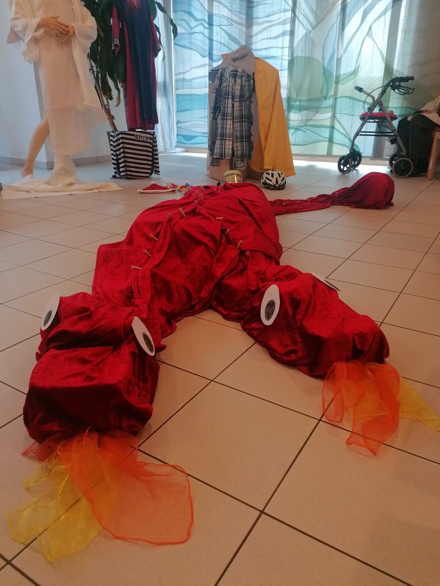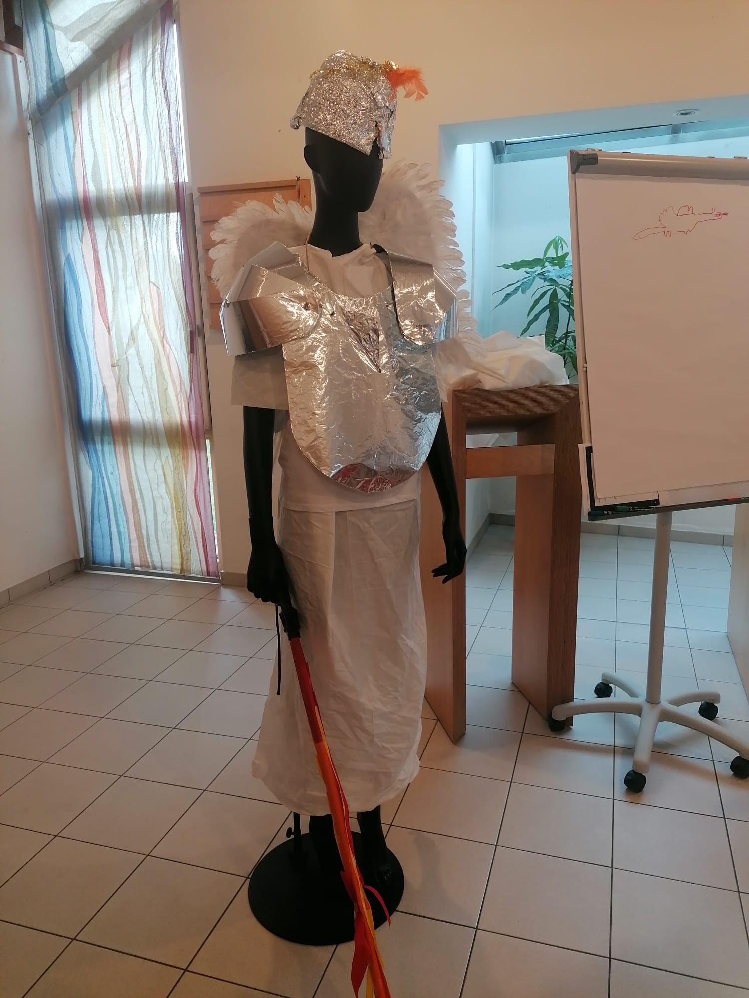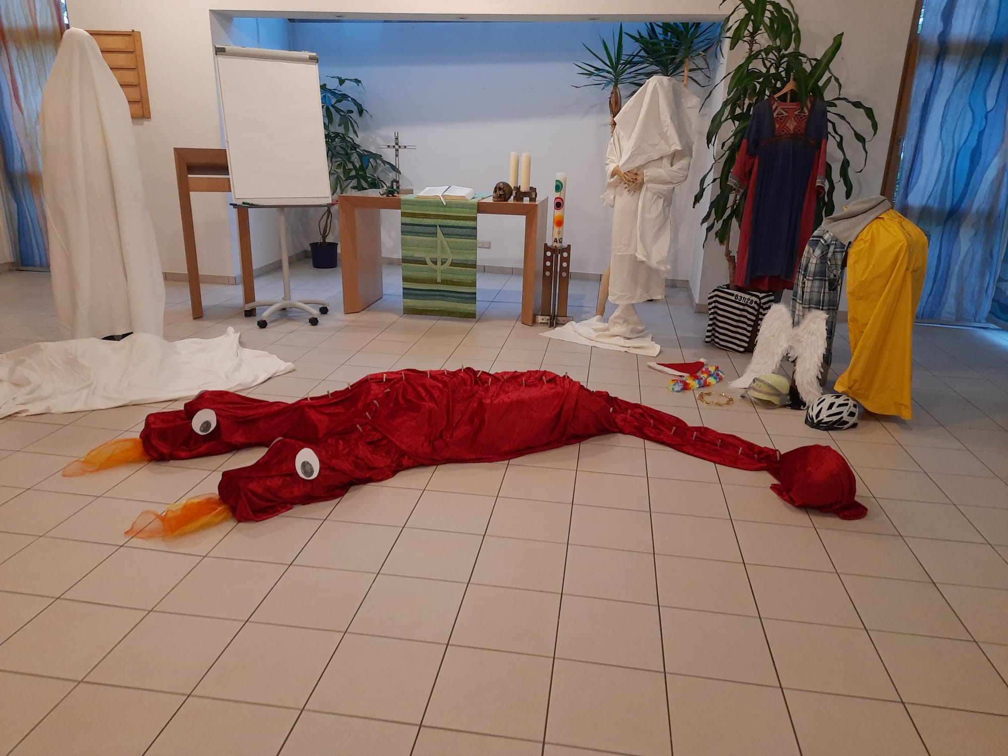 Nein, war sich die Gemeinde einig. Und dann wurde eine zweite Schaufensterpuppe eingekleidet mit Brustpanzer und Helm, Engelsflügeln, Schulterpolstern und Flammenschwert. Dieser Erzengel Michael war ein würdiger Gegner für den bösen Drachen.