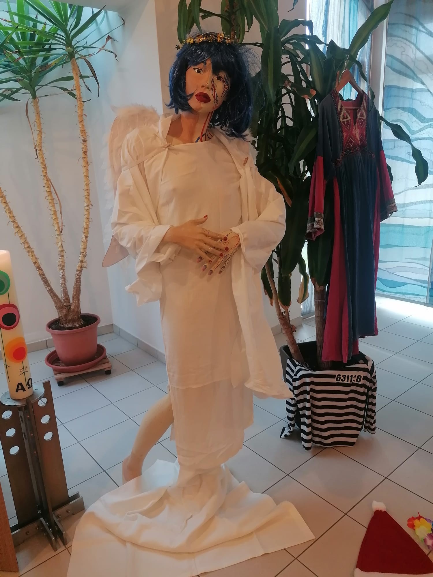 Mit den anwesenden Kindern wurde eine Schaufensterpuppe Weihnachtsengel gleich angezogen. Weiss gewandet, mit Flügeln und Goldsternchen-Heiligenschein. Ob solch ein Engel mit seiner Botschaft "Ehre sei Gott in der Höhe und Frieden auf Erden!“ gegen den bösen Drachen angehen konnte?!.